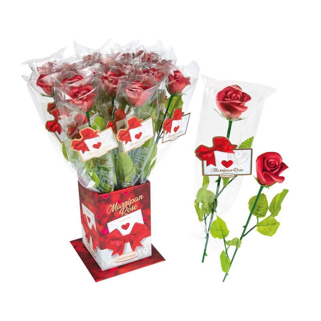 Rote Marzipan-Rosen am Stiel mit Briefchen für die persönlichen Nachrichten an Ihre Kunden und Gäste.