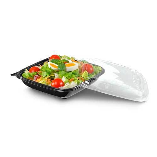 Das trendige Design der schwarzen PET-Salataschale mit Deckel wertet Ihre Salate,