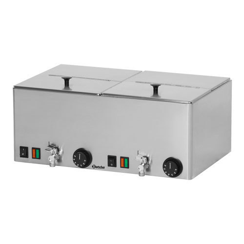 Praktischer Würstchenwärmer mit 2 getrennten Kammern, Wasserablaufhahn und aufklappbaren Deckeln. Ideal für Kantinen, Kioske und viele mehr.