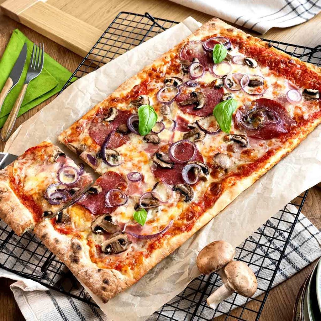 Pizza al taglio nelle dimensioni normalizzate per la gastronomia. La soffice base precotta è condita con salsa di pomodoro aromatizzata e formaggio saporito. Da arricchire a piacere.